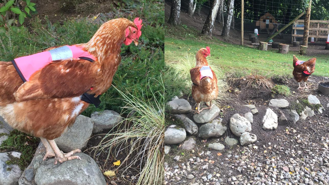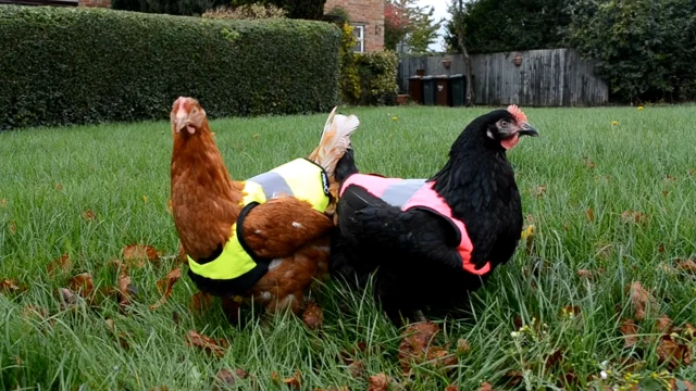 Chook out Pet hens Davina and Deidre are given HI VIS jackets Very well made.