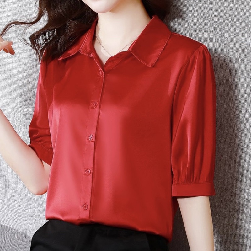 2024 Chinese New Year Office Wear Mid Sleeve Rayon Blouse with Collar Formal Casual Attire Professional Clothes Korean Very well made.
