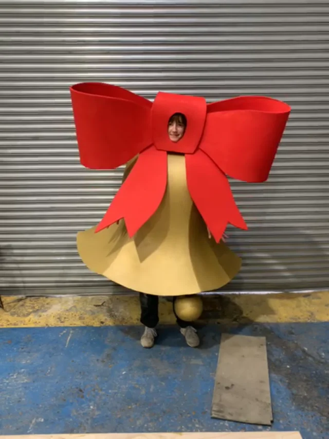 Child wearing golden inflatable church bell costume on Craiyon Very well made.