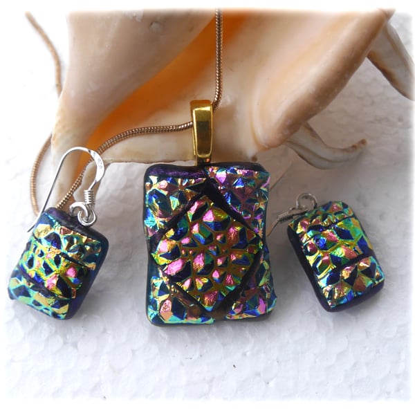 Dichroic Jewellery Necklace and Earrings Set Midnight Blue Dark Green Very well made.