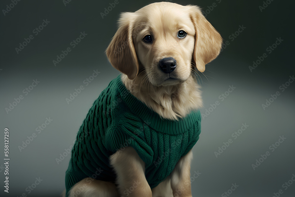 Cute little golden retriever in a green sweater Generative AI Very well made.