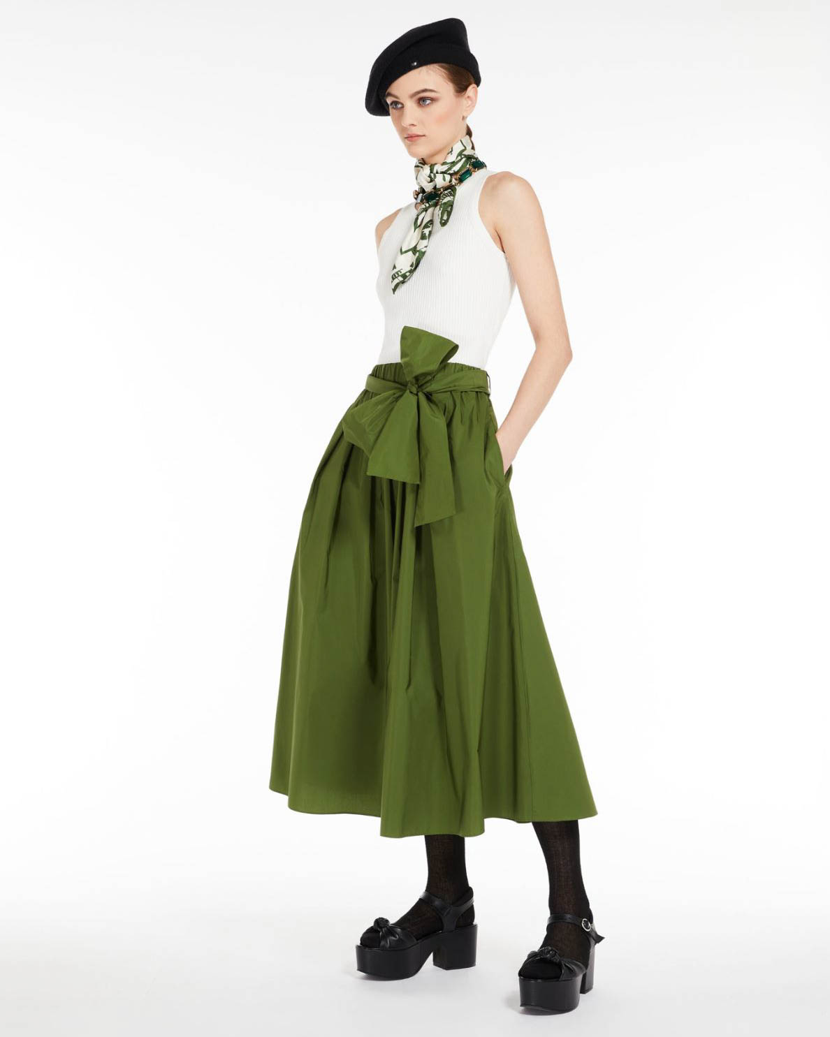 Gonna midi verde dalla line a ruota in taffet di misto cotone con Very well made.