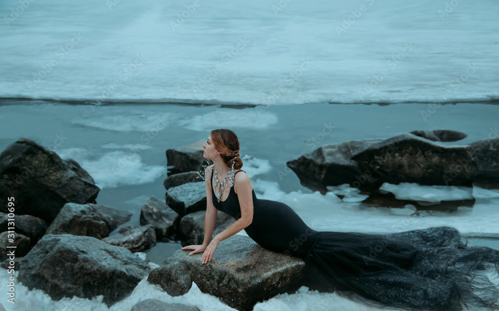 Sexy Woman long black dress silhouette mermaid sitting on stone Very well made.
