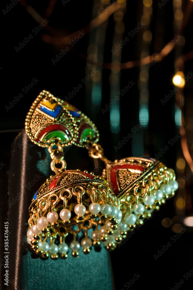 Indian Style Ear Stud Golden Jimikki with Pearl Patch Stock Photo Very well made.