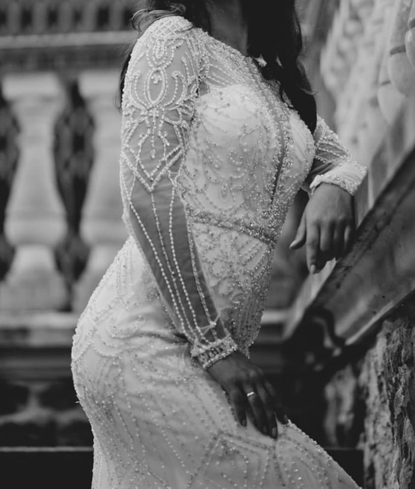 Style 9894 Plunging V Neck Allover Beaded Fit and Flare Gown Very well made.
