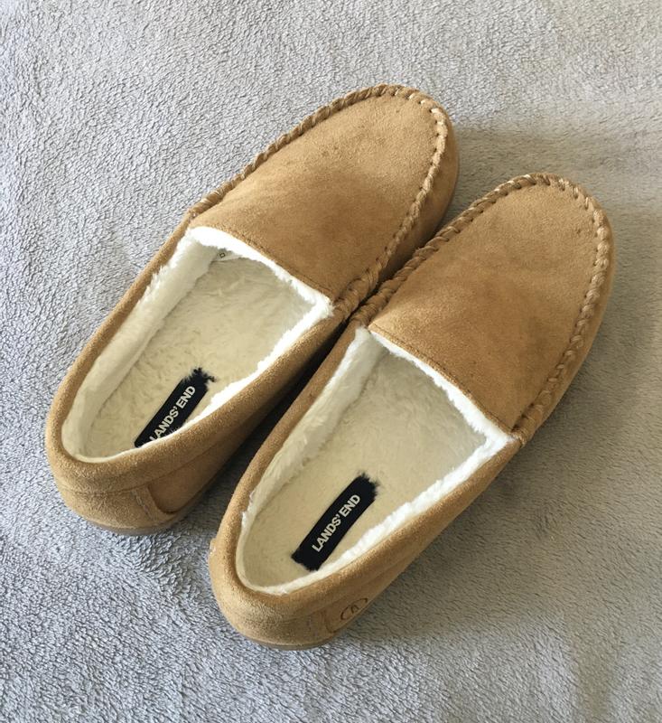 Men s Suede Leather Flannel Lined Moccasin Slippers Lands End Very well made.