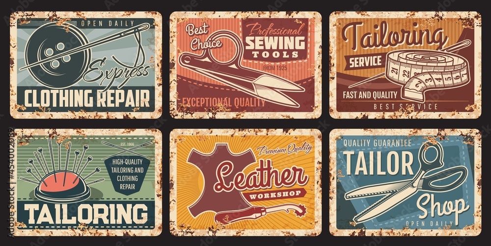 Tailor sewing shop metal plates rusty and vintage posters vector Very well made.