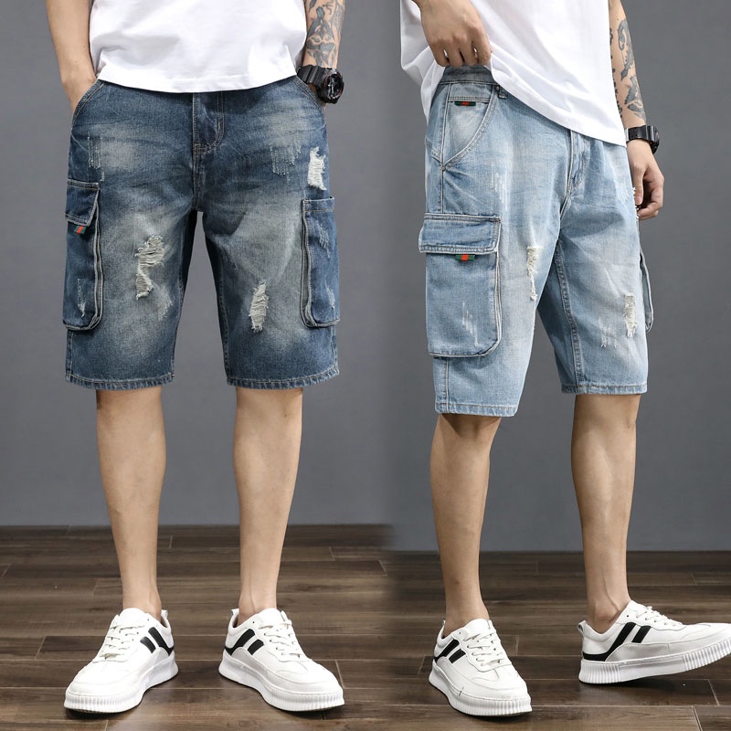 Men s Ripped Denim Cargo Shorts Wash Multi Pocket Short Jeans with Very well made.
