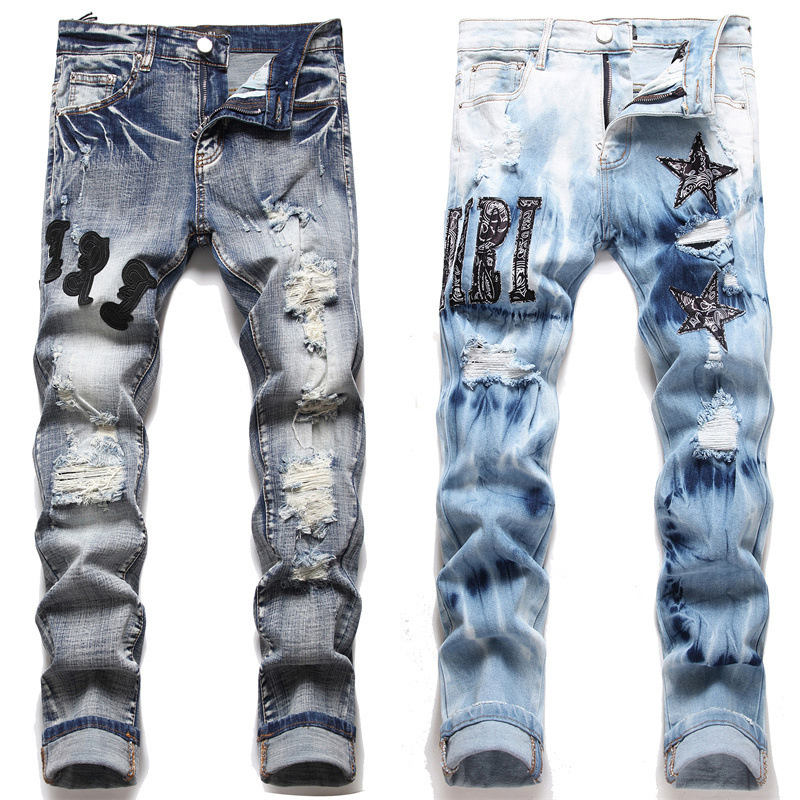 Mens Jeans Slim Fits Punk Embroidery Jeans Ripped Stretch Denim Very well made.