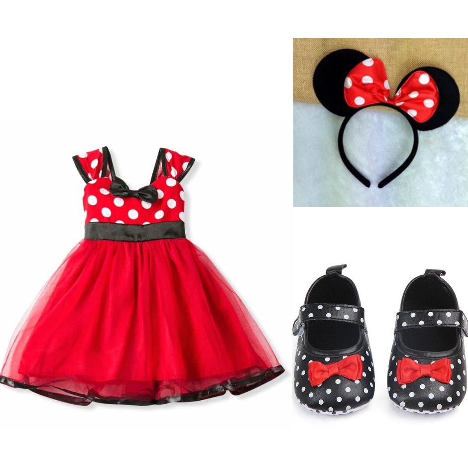 Baby Girl Minnie Mouse Dress Headband Shoes Set Polka Dots Red Very well made.
