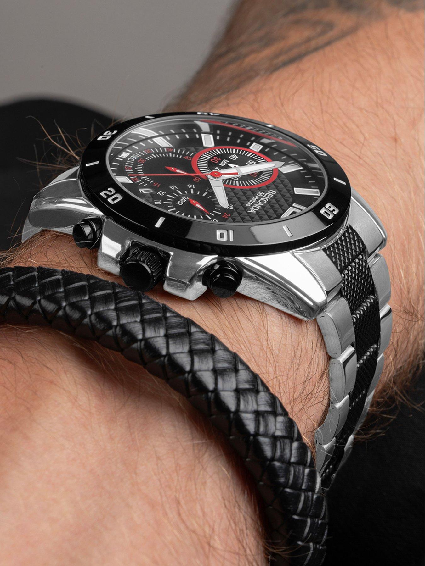 Sport Gift Set Men s 44mm Chronograph Watch with Black Dial Two Tone Stainless Steel Bracelet and Black Leather Braided Bracelet Very well made.