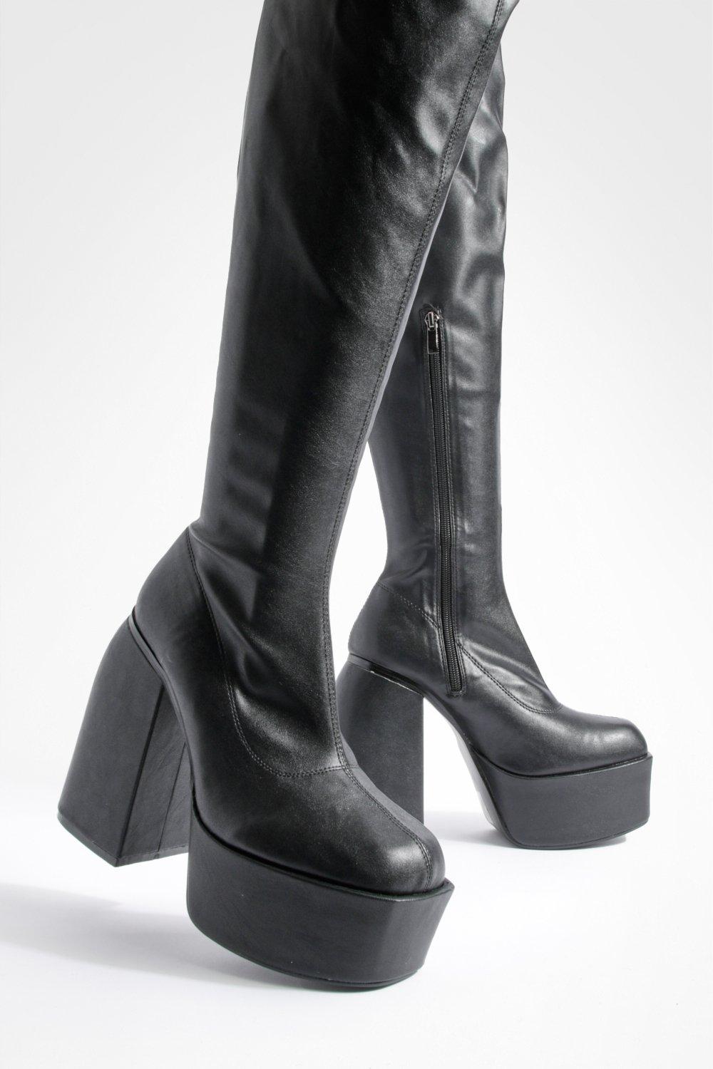 Platform Block Heel Stretch Pu Knee High Boots boohoo Very well made.