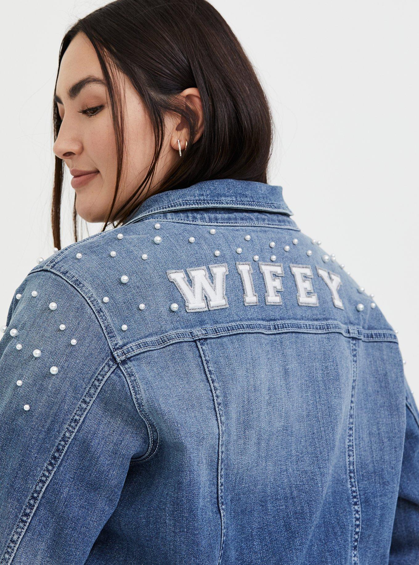 Plus Size Wifey Embroidered Faux Pearl Denim Jacket Medium Very well made.