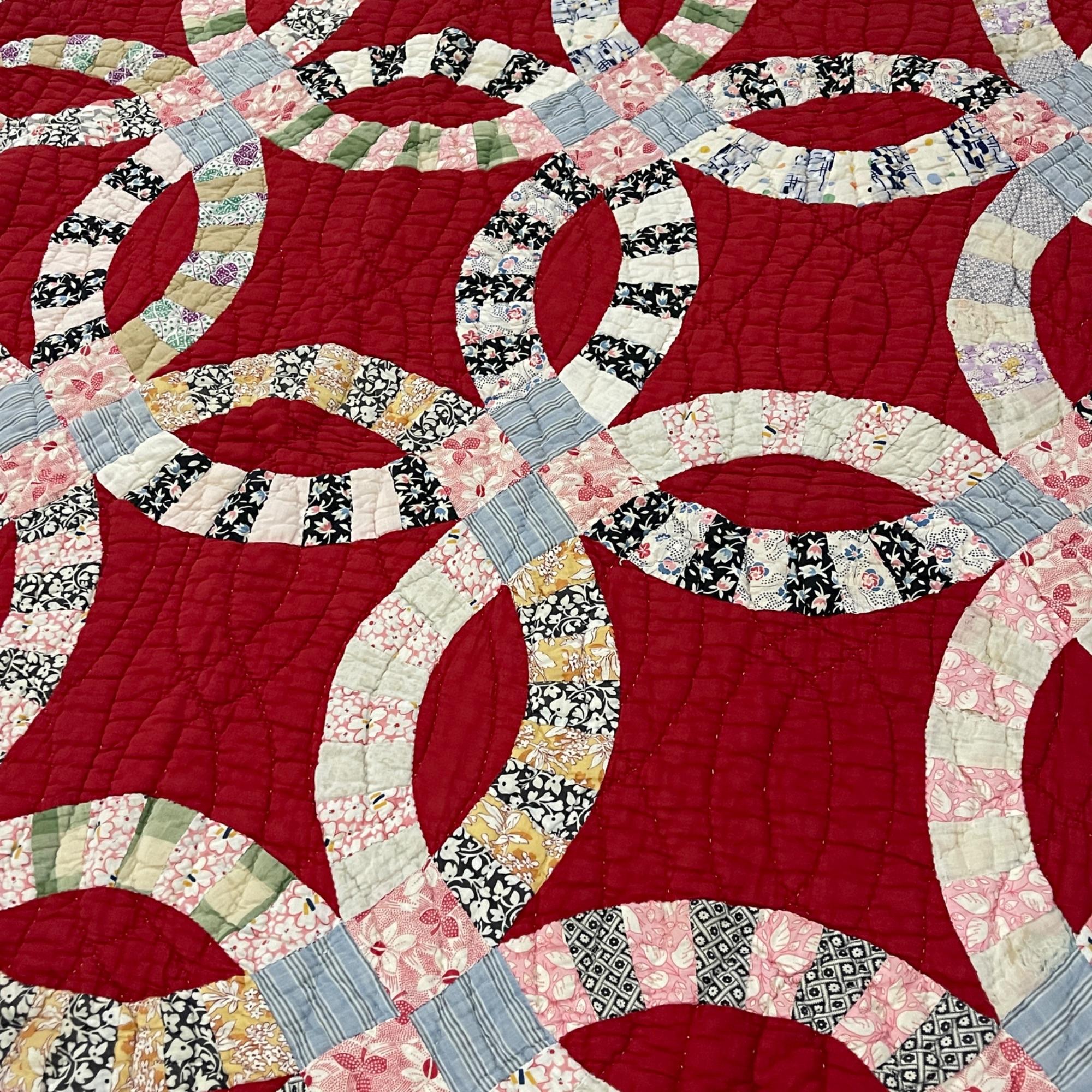 Vintage Hand Stitched Double Wedding Ring Quilt Orange Red Very well made.