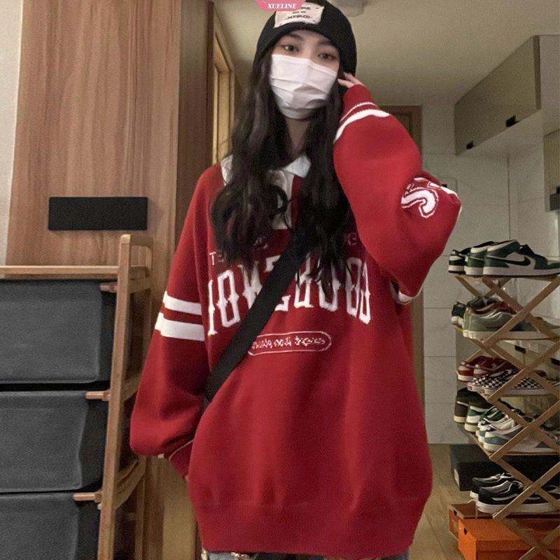 Christmas theme Korean Fashion Red Oversized Sweatshirts Women Harajuku Hoodie Vintage Loose Casual Polo Collar Pullover Tops WOW Very well made.