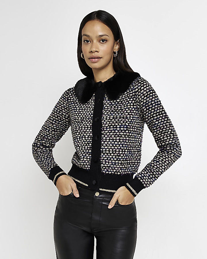 Buy River Island Black Girls Boucle Fur Collar Cardigan Set from Very well made.