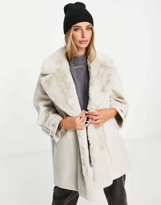 River Island Ausgestellter Mantel in Taupe mit Kunstpelzbesatz Very well made.