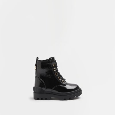 Mini girls black lace up patent chunky boots Very well made.