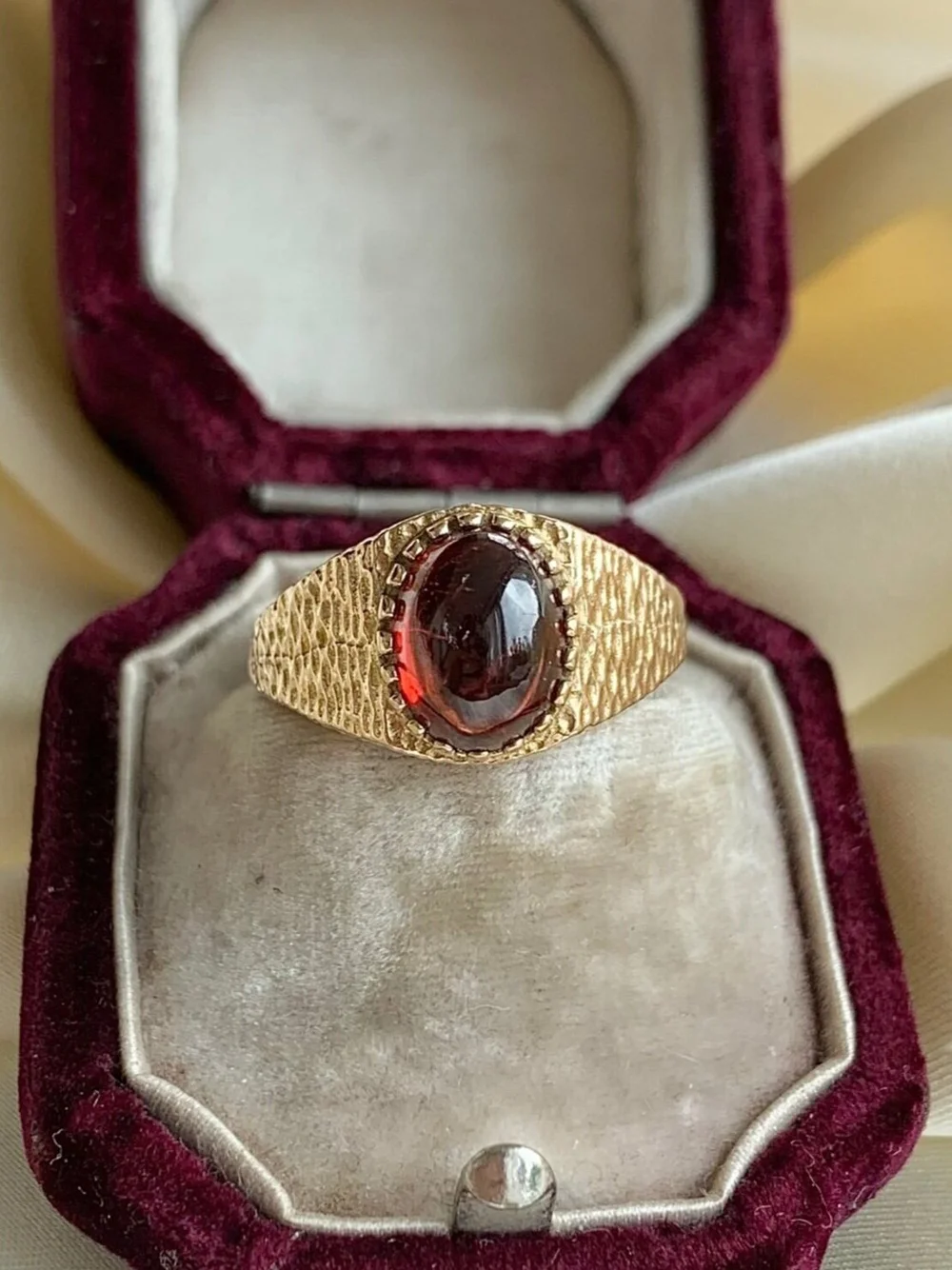 Vintage 9ct Yellow Gold Bark Effect Cabochon Garnet Ring Gembank1973 Very well made.