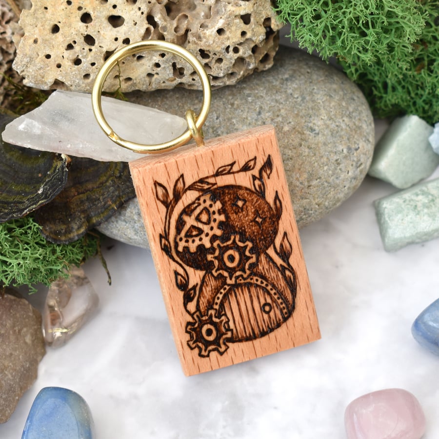 Steampunk fungi fairy abode. Pyrography key ring Very well made.