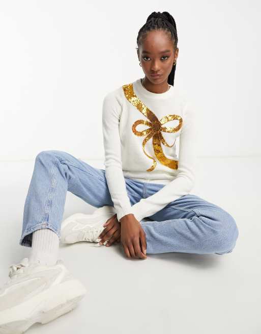 Brave Soul Tall christmas jumper with gold sequin bow in cream Very well made.