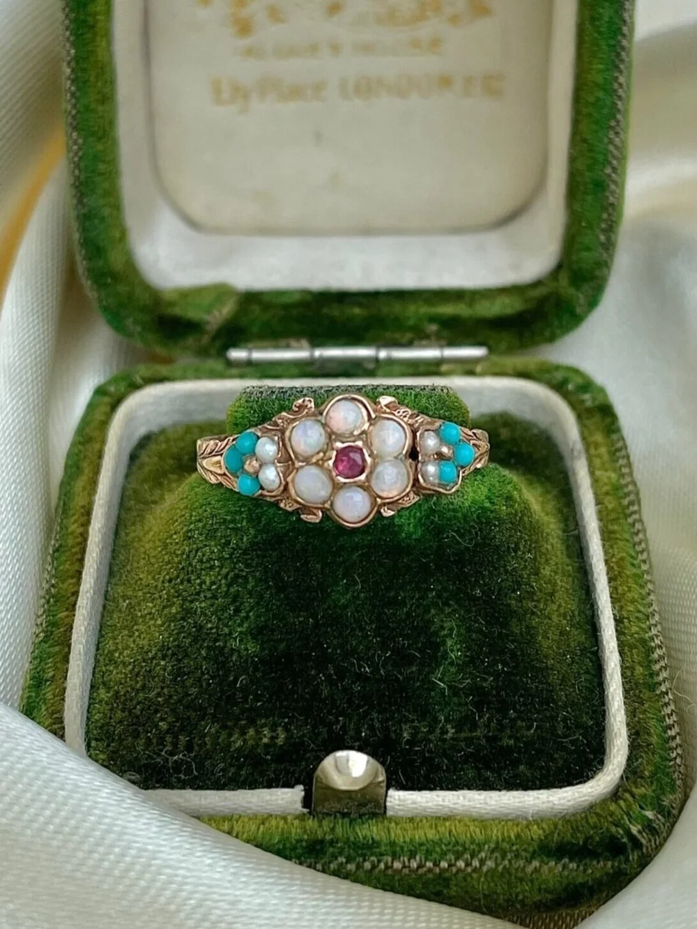 Sweet Victorian 9ct Yellow Gold Opal Ruby Turquoise and Pearl Triple Cluster Ring Gembank1973 Very well made.