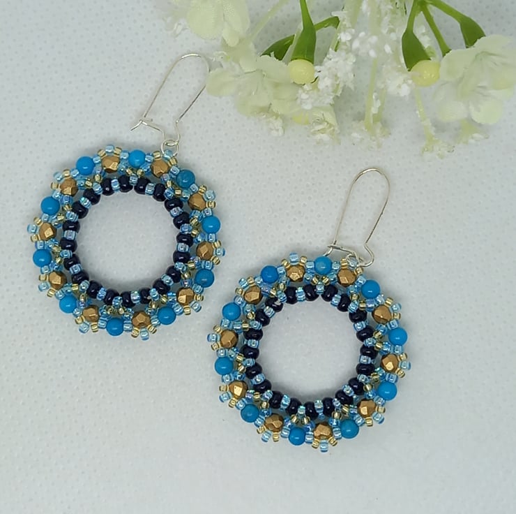 Beaded Hoop Earrings For Women Boho Beaded Earring Hoops Large Black Turquoise and Navy Blue Stone Bead Dangle Earrings Very well made.