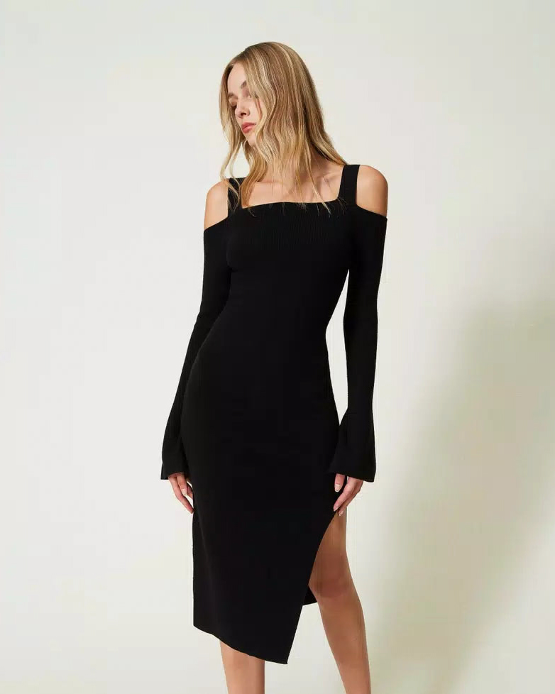 Abito midi nero in maglia off shoulder con spalline spesse maniche Very well made.