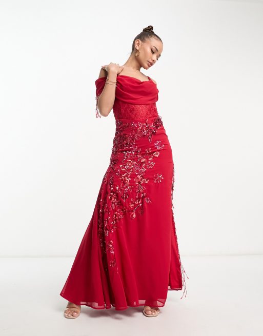 Starlet Vestito lungo con scollo alla Bardot e spacco sulla coscia rosso in pizzo a fiori con frange di perline Very well made.