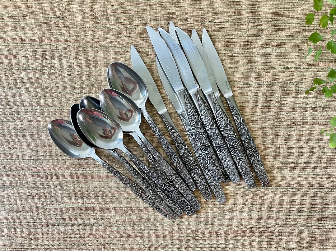 vintage Japan stainless flatware set Normandy ornate floral Very well made.