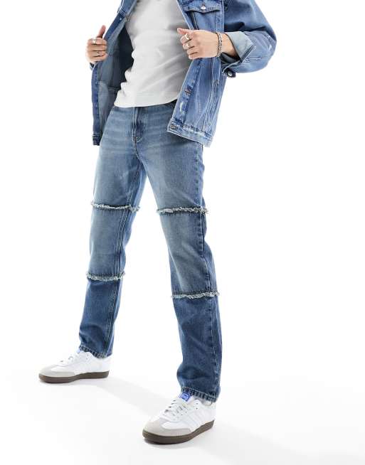ASOS DESIGN straight leg jeans with frayed hem panels in mid wash Very well made.