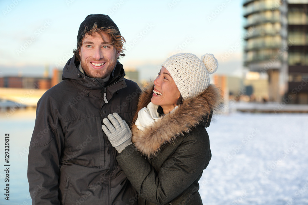 Winter couple in snow hat and coats. Happy young adults walking Very well made.