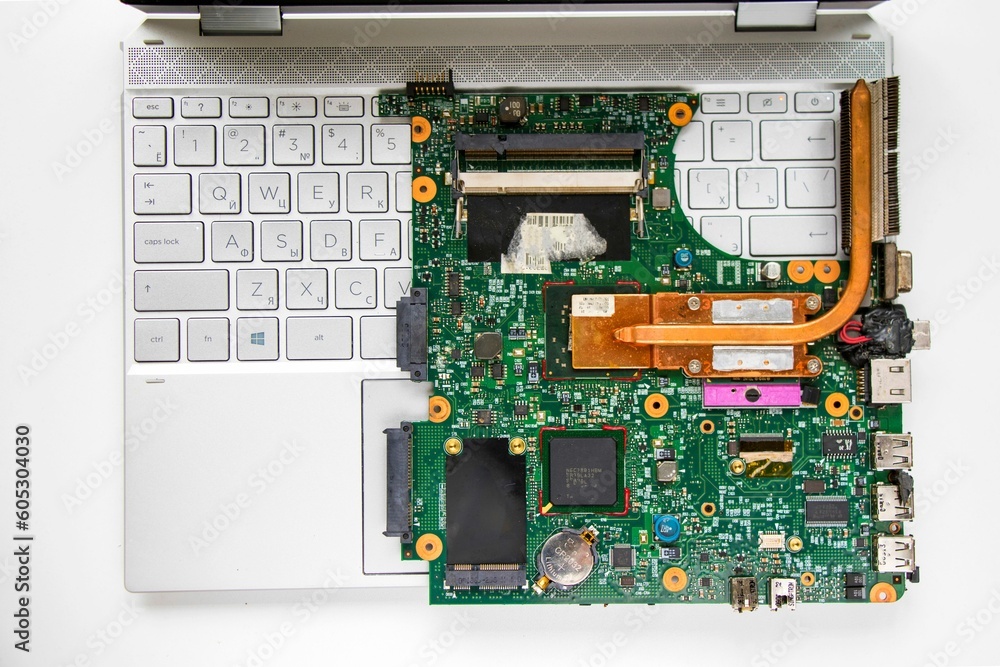Top view of motherboard parts placed on a laptop Stock Photo Very well made.