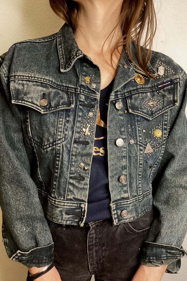 1990s Light Wash Bedazzled Black Denim Jacket Selected by Cherry Very well made.