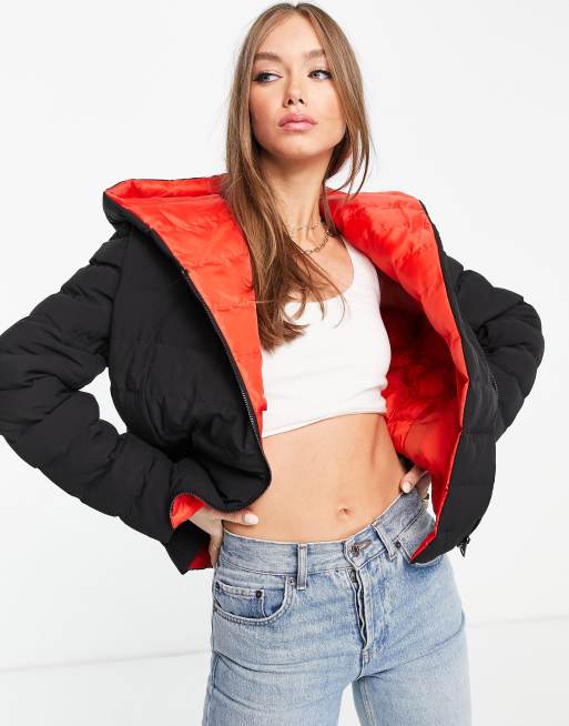 French Connection Lola padded jacket with red hood in black Very well made.