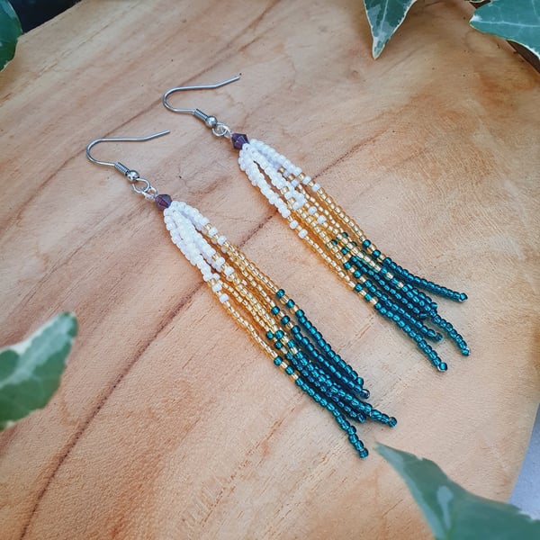 Long dangle beaded earrings Seed bead earrings Fringe earrings Green and gold ea Very well made.