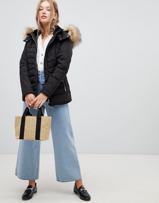 New Look Ladies Black Fur Hooded Parka with Leather Details Black Very well made.