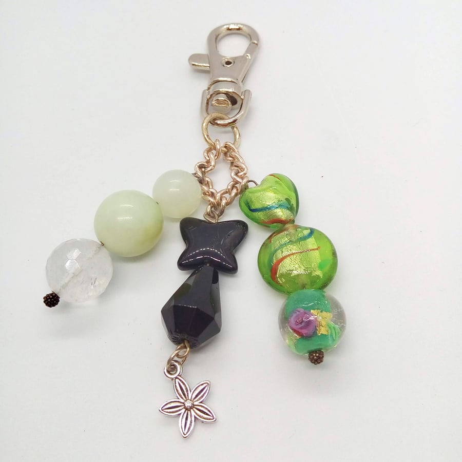 Beaded Bag Charm with Jade Beads Green and Black Glass Beads and a Flower Charm Very well made.