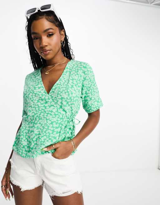 Pieces Blusa verde a fiori con maniche a sbuffo e lacci laterali in coordinato Very well made.