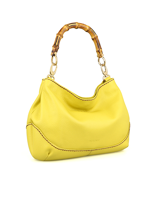 Borsa a spalla gialla in pelle martellata con manico in bamboo e Very well made.