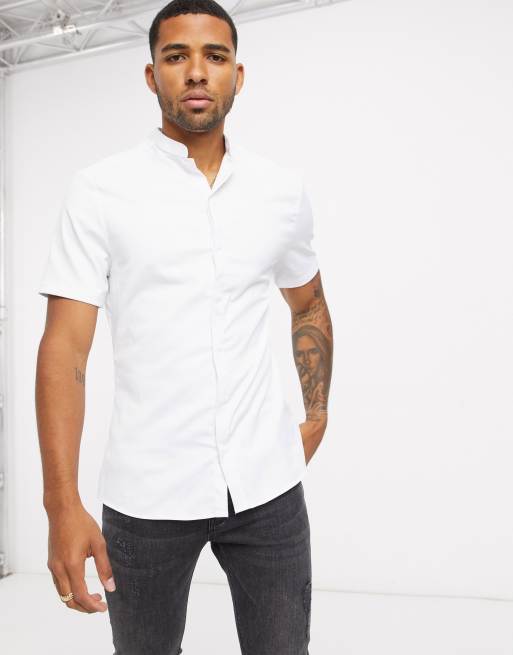 ASOS DESIGN Camicia skinny a maniche corte bianca in rasatello con colletto alla coreana Very well made.